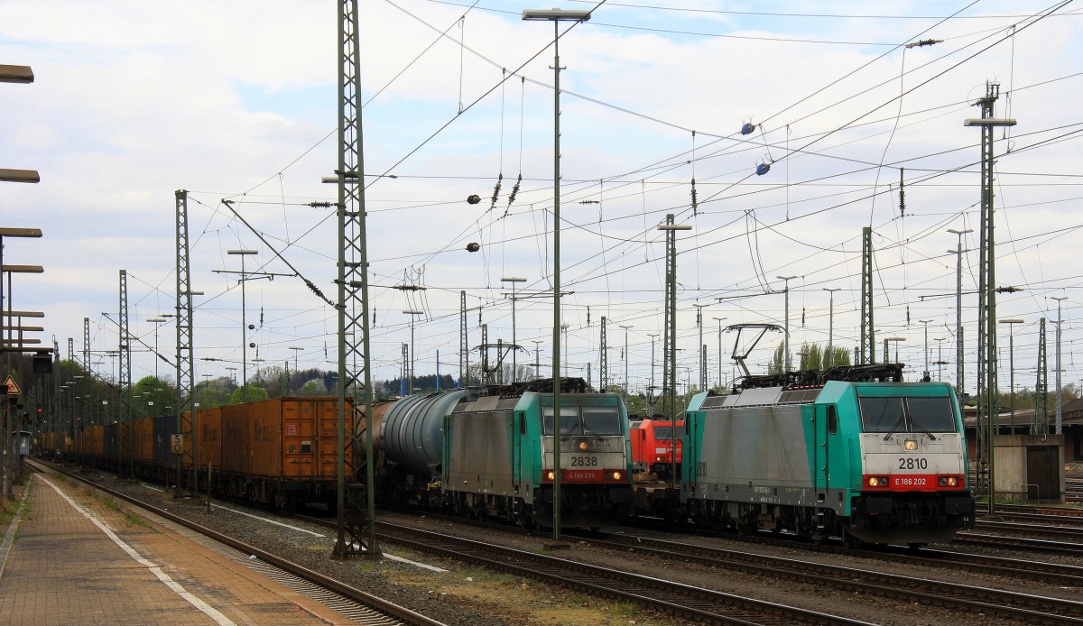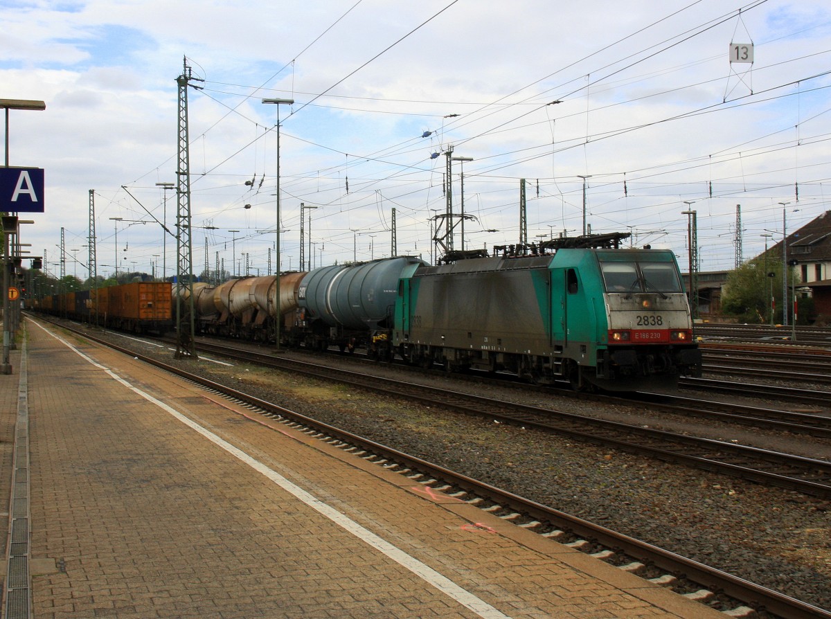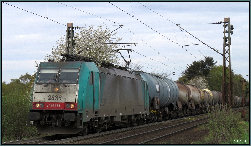 Die Cobra 2838 fährt mit einem langen Kesselzug aus Ludwigshafen-BASF nach Antwerpen-BASF(B), aufgenommen bei der Ausfahrt aus Aachen-West in Richtung Montzen/Belgien. Aufgenommen vom Bahnsteig in Aachen-West bei Sonne und Regenwolken am Nachmittag vom 6.4.2014.