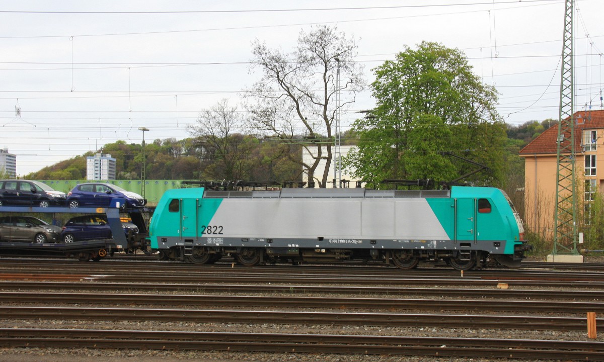 Die Cobra 2822 fährt mit einem langen Citroen-Auto-Zug aus Kolín(CZ) nach Zeebrugge-Pelikaan(B), aufgenommen bei der Ausfahrt aus Aachen-West in Richtung Montzen/Belgien. Aufgenommen vom Bahnsteig in Aachen-West bei Sonne und Regenwolken am Nachmittag vom 6.4.2014.
