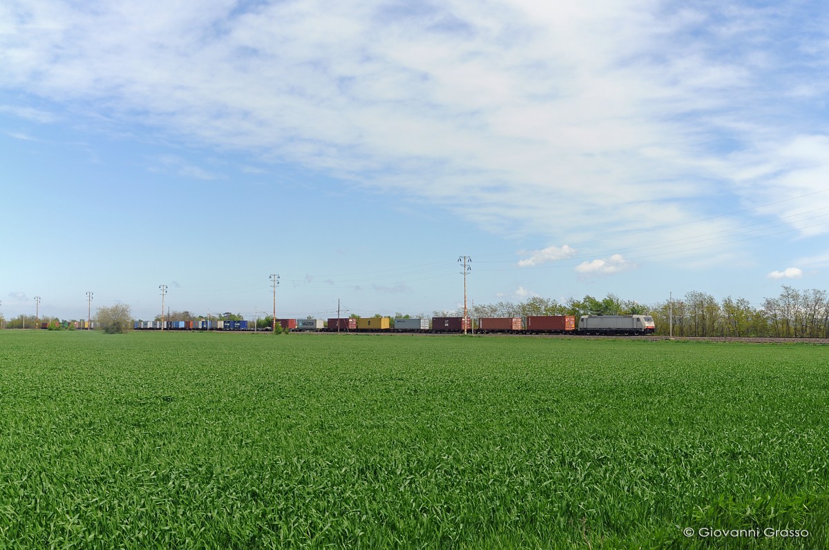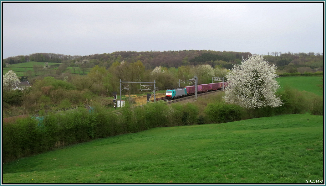 Frühling an der Montzenroute bei Nouvelaer in Belgien. Die Cobra passt sich farblich den Begebenheiten an und fährt mit ihren Güterzug nach Antwerpen. Szenario vom 03.April 2014.