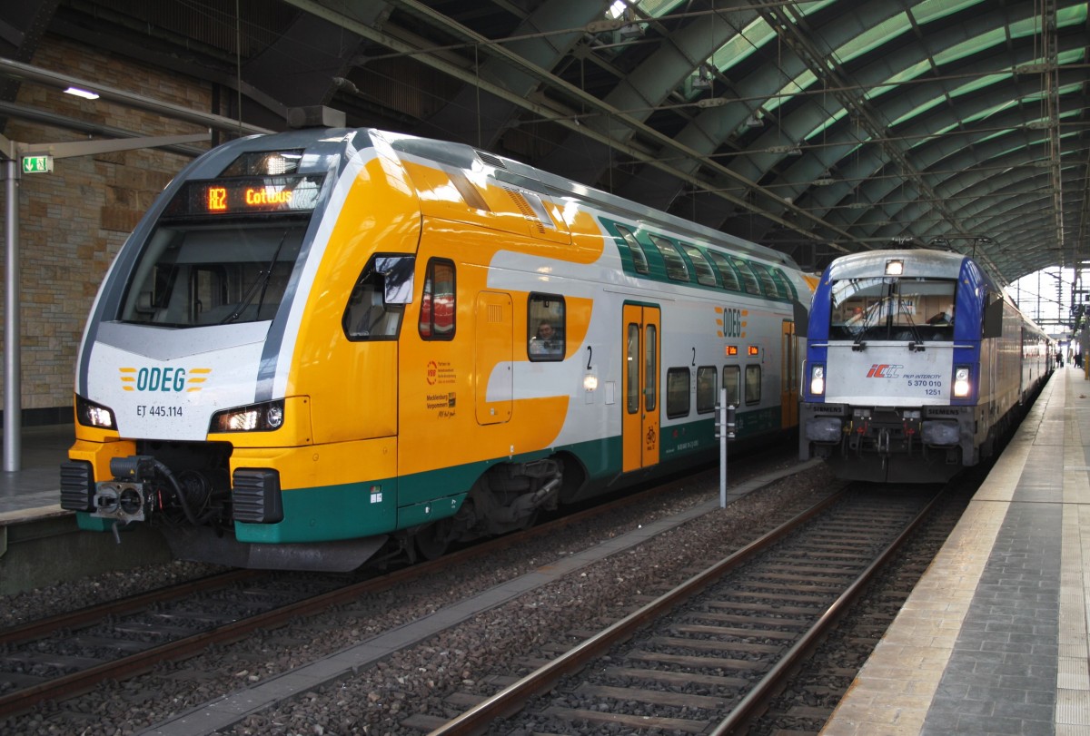 Hier links 445 114-2 als RE2 (RE83974) von Wismar nach Cottbus und rechts 5 370 010 mit EC55 von Berlin Hbf. nach Gdynia Glowna (auf Grund eines Böschungsbrands zwischen Berlin und Fürstenwalde endete dieser Zug in Berlin Ostbahnhof), diese beiden Züge begegneten sich am 29.3.2014 in Berlin Ostbahnhof.