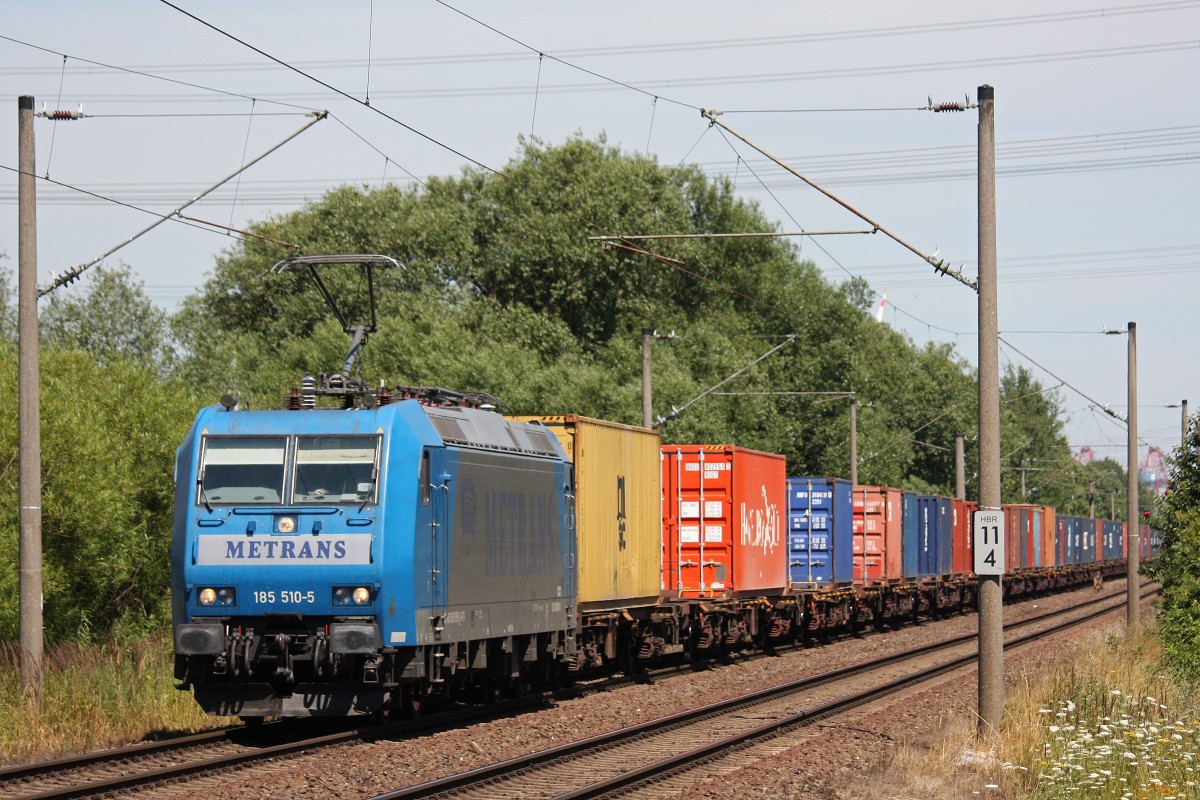 Metrans 185 510 am 22.7.13 mit einem Containerzug in Hamburg-Moorburg.