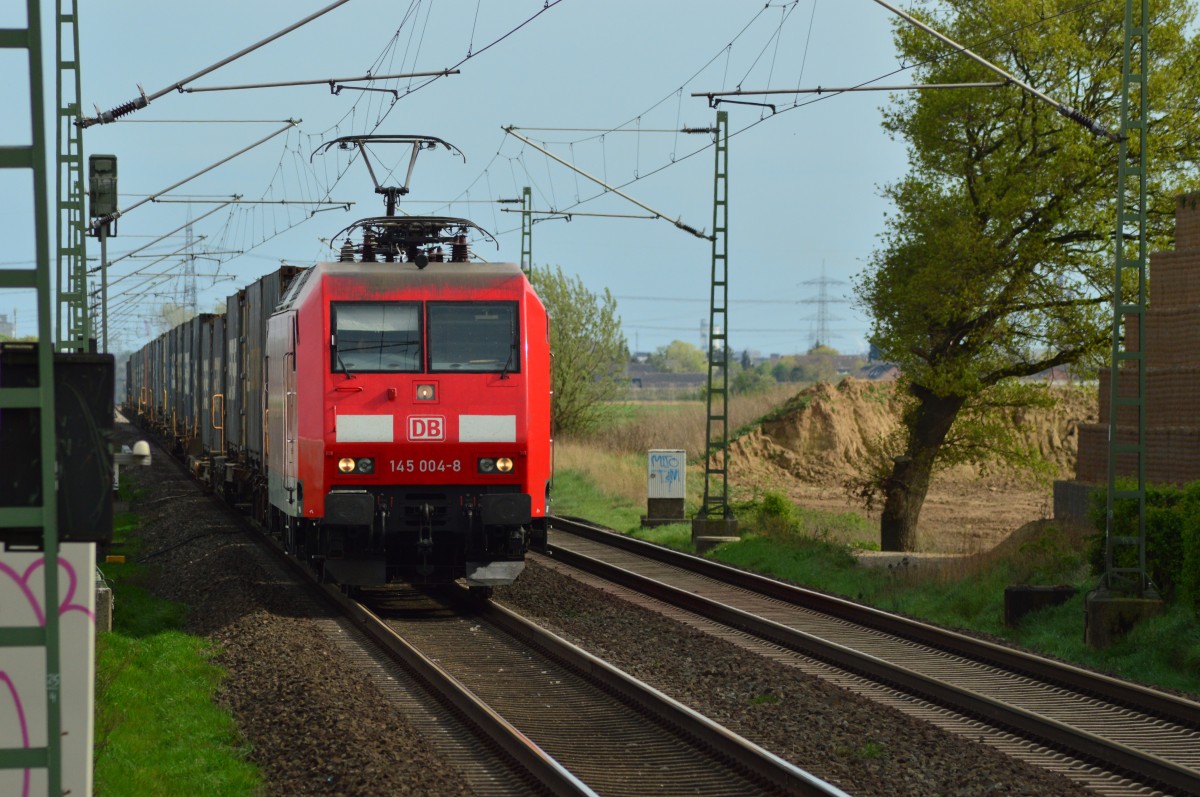 Mit einem Kastelzug kommt die 145 004-8 gen Neuss auf der Kbs 495 gefahren, hier ist sie bei Neuss Allerheiligen. 6.4.2014