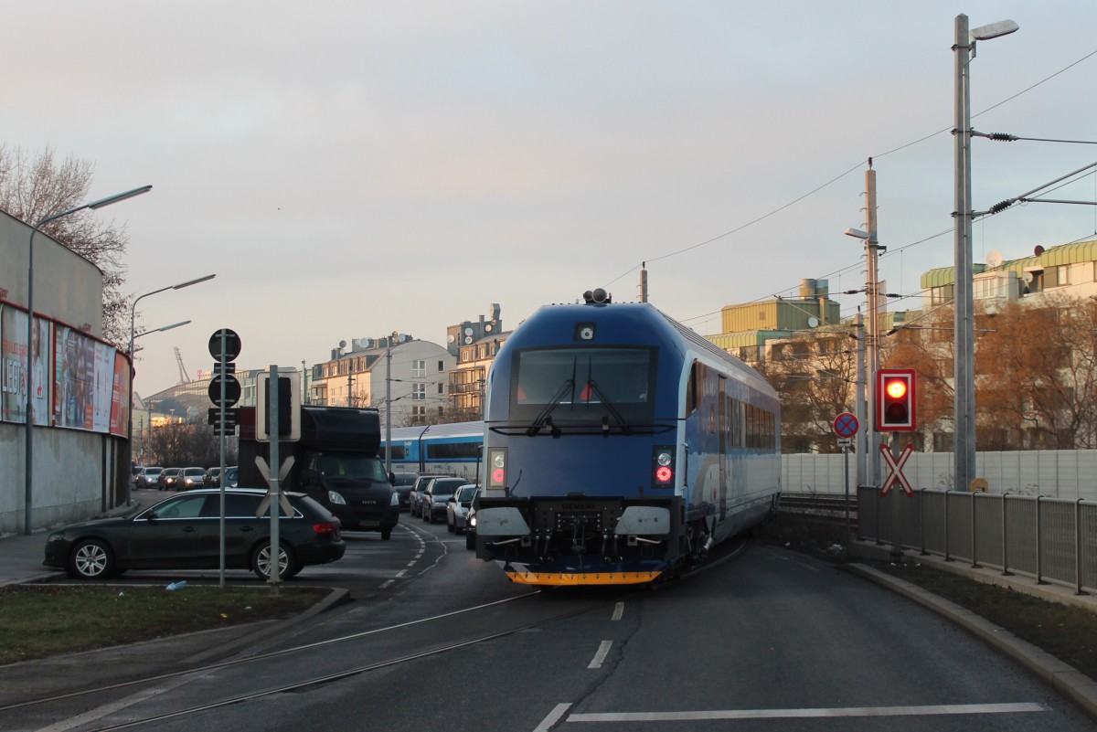 SPROB 97666 von Ebenfurth (Ef) nach Simmering Aspangbahn (Sah), weiter in die AB Siemens, hier zum sehen die 5-teilige CZ CD RailJet Garnitur, geschoben wurde sie bis zur Weiche von 1216 235; am 07.02.2014