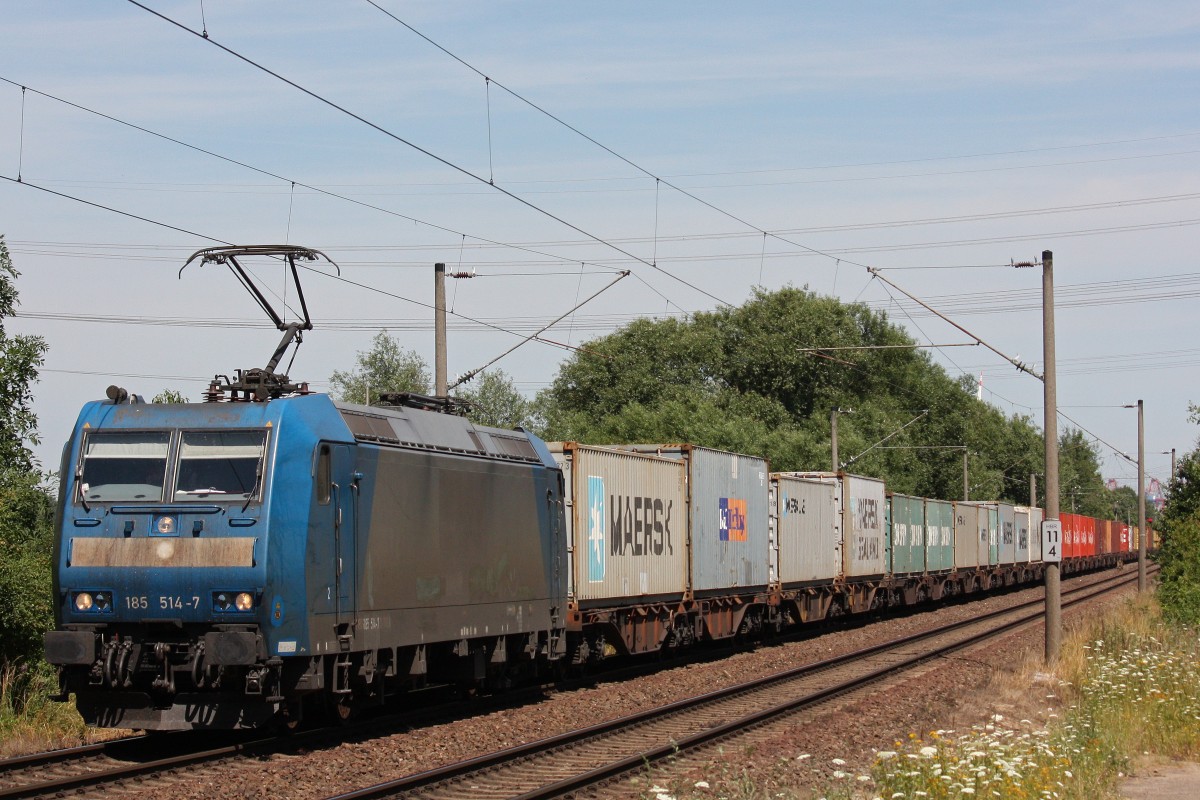 TXL 185 514 am 22.7.13 mit einem Containerzug in Hamburg-Moorburg.