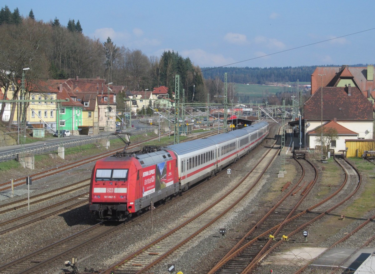 101 092-5 "Bernina Express" schiebt am 27. März 2014 den IC 2208 durch Kronach in Richtung Saalfeld.