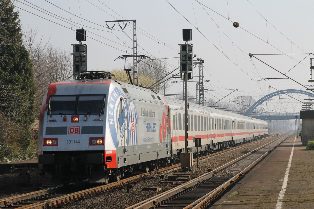101 144 mit IC 133 Luxembourg-Nordeich Mole auf Bahnhof Salzbergen am 14-3-2014.