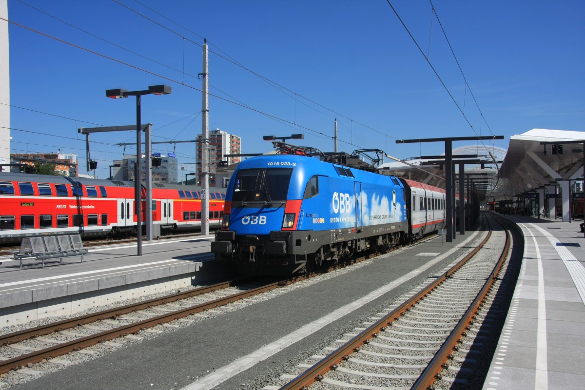 1216 230 ist mit EC 173 nach Villach unterwegs. Das Foto entstand am 07.04.2014 in Wien Praterkai.