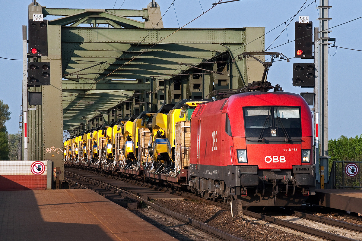 1116 163 hat soeben mit dem DG 45043 die Donaubrücke in Wien überquert. Die Aufnahme in Wien Praterkai entstand am 07.04.2014.