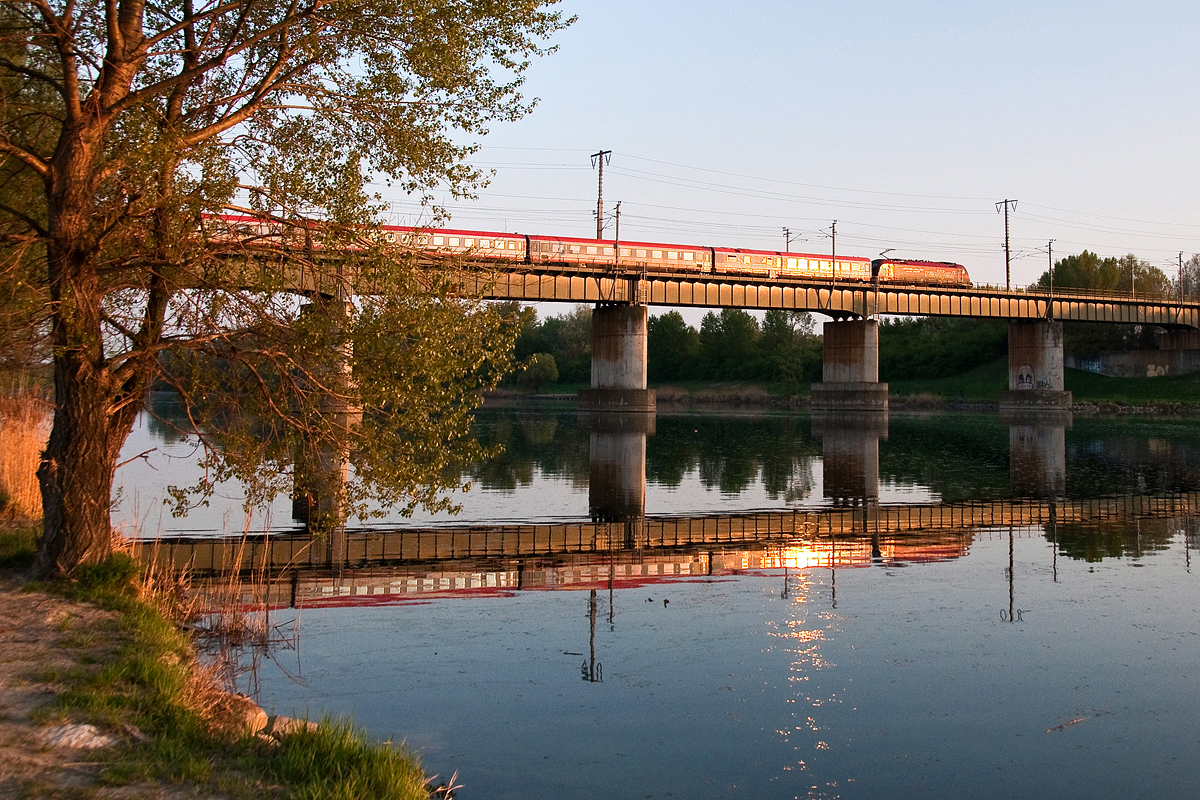 1216 229 "Spirit of Praha" mit EC 279 spiegelt sich am Abend des 07.04.2014 in der neuen Donau in Wien.