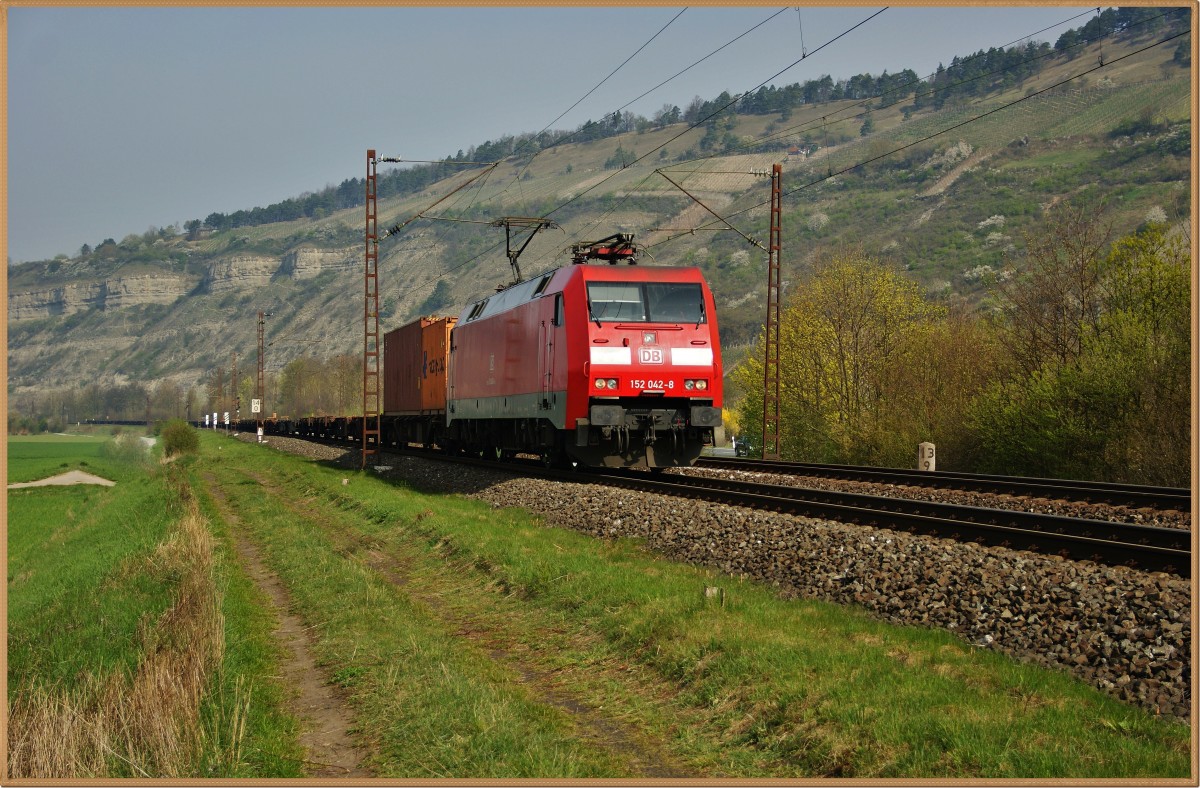 152 042-8 mit fast leeren Containerzug am 01.04.14 bei Thüngersheim.
