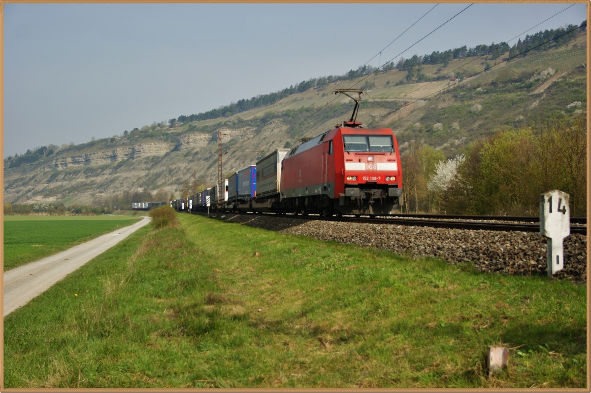 152 108-7 mit einen Aufliegerzug Richtung Süden am 01.04.14 bei Thüngersheim.