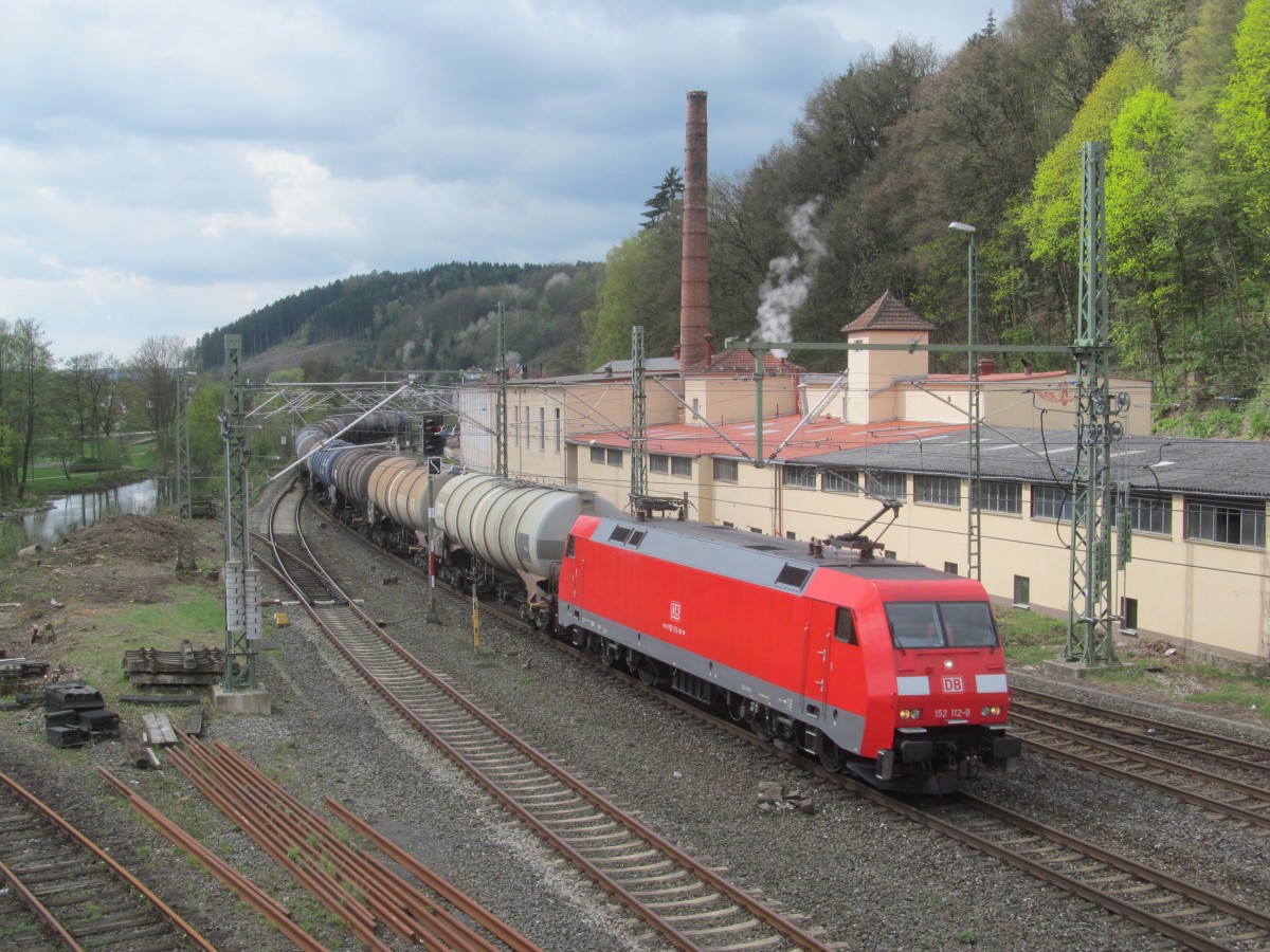 152 112-9 zieht am 09. April 2014 einen Kesselwagenzug durch Kronach in Richtung Saalfeld.