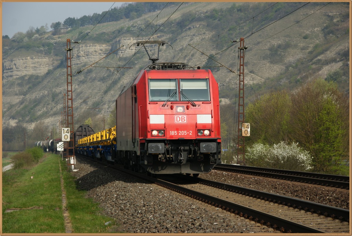 185 205-2 mit einen gemischten Güterzug Richtung Würzburg bei Thüngersheim am 01.04.14.