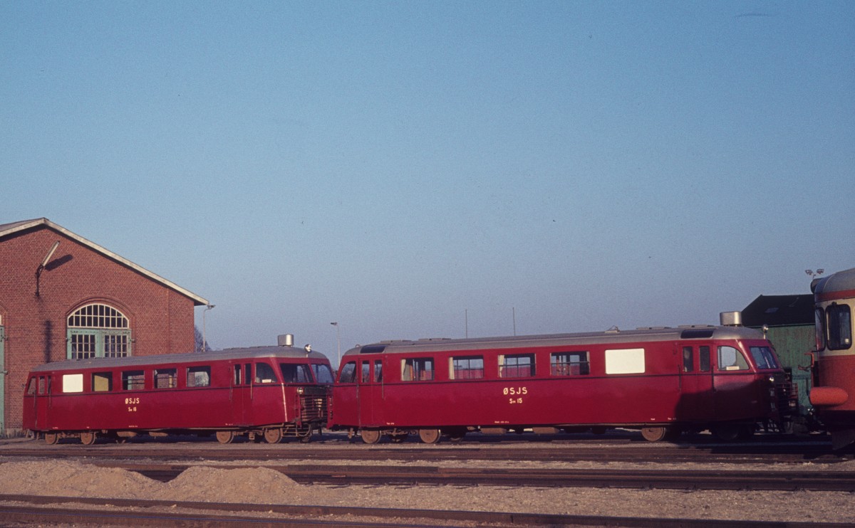 ØSJS (Østsjællandske Jernbaneselskab, Østbanen): Die Schienenbustriebwagen Sm 16 und Sm 15 halten am 9. März 1974 abgestellt in Hårlev.