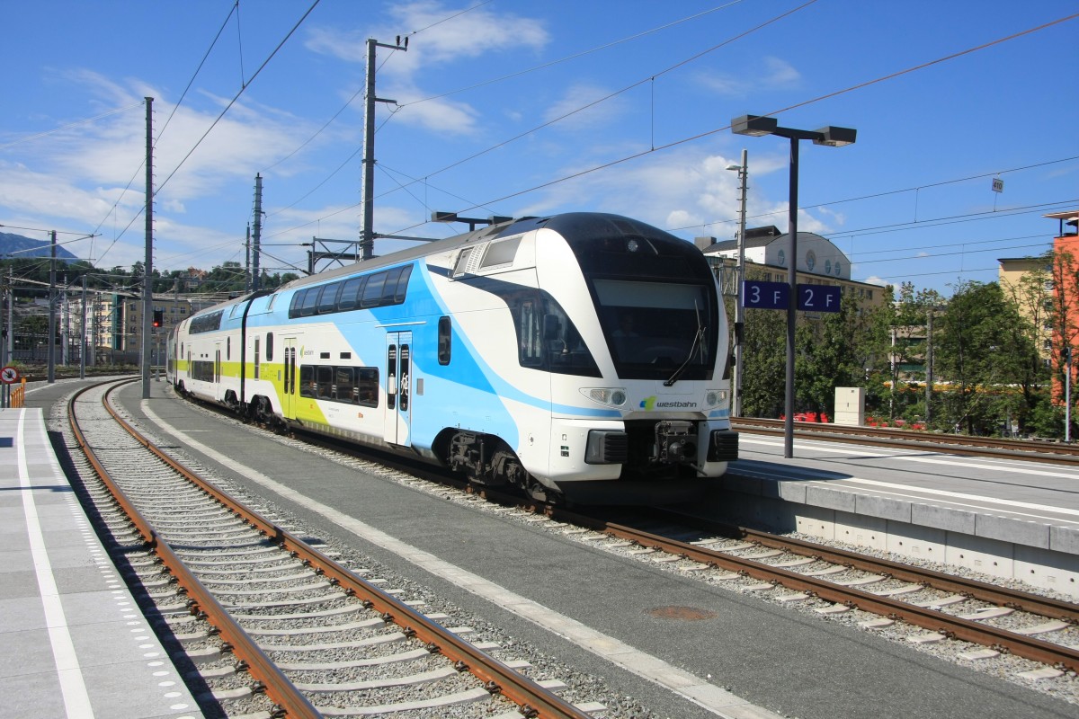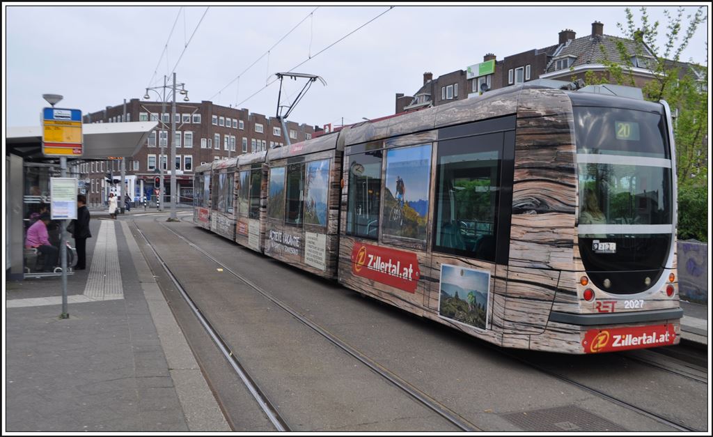 Linie 20 Alstom Citadis 2027 mit Zillertalerwerbung am Haltepunkt Randweg. (05.04.2014)