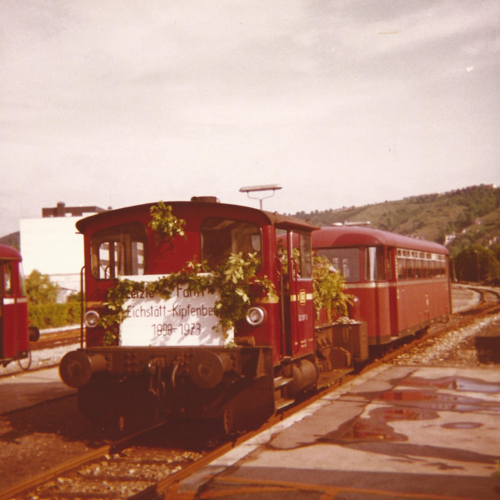 Am 02.06.1973 fuhr der letzte Personenzug von Eichstätt nach Kipfenberg durchs Altmühltal. Hier eine Köf III mit "Beiwagen" in Eichstätt Bahnhof. Das Foto stammt von meinem Vater Franz Bauch.