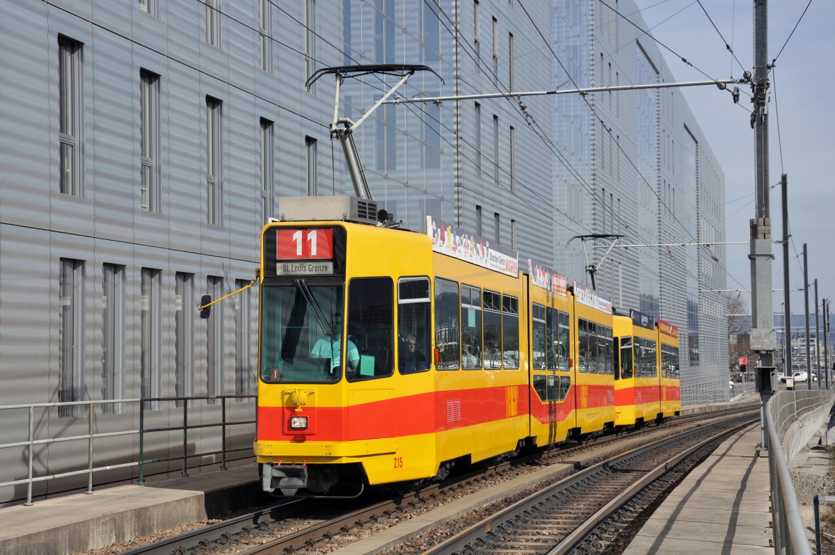 Be 4/8 215 und der Be 4/6 258 auf der Linie 11 kurz vor der Haltestelle Peter Merian. Die Aufnahme stammt vom 29.03.2014.