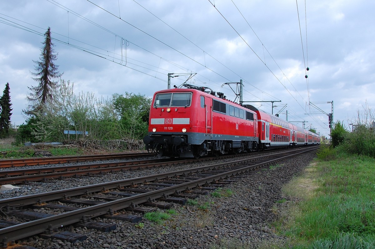 Bei der Durchfahrt in Kleinenbroich ist hier die 111 129 mit einem RE4 nach Aachen zu sehen. 9.4.2014