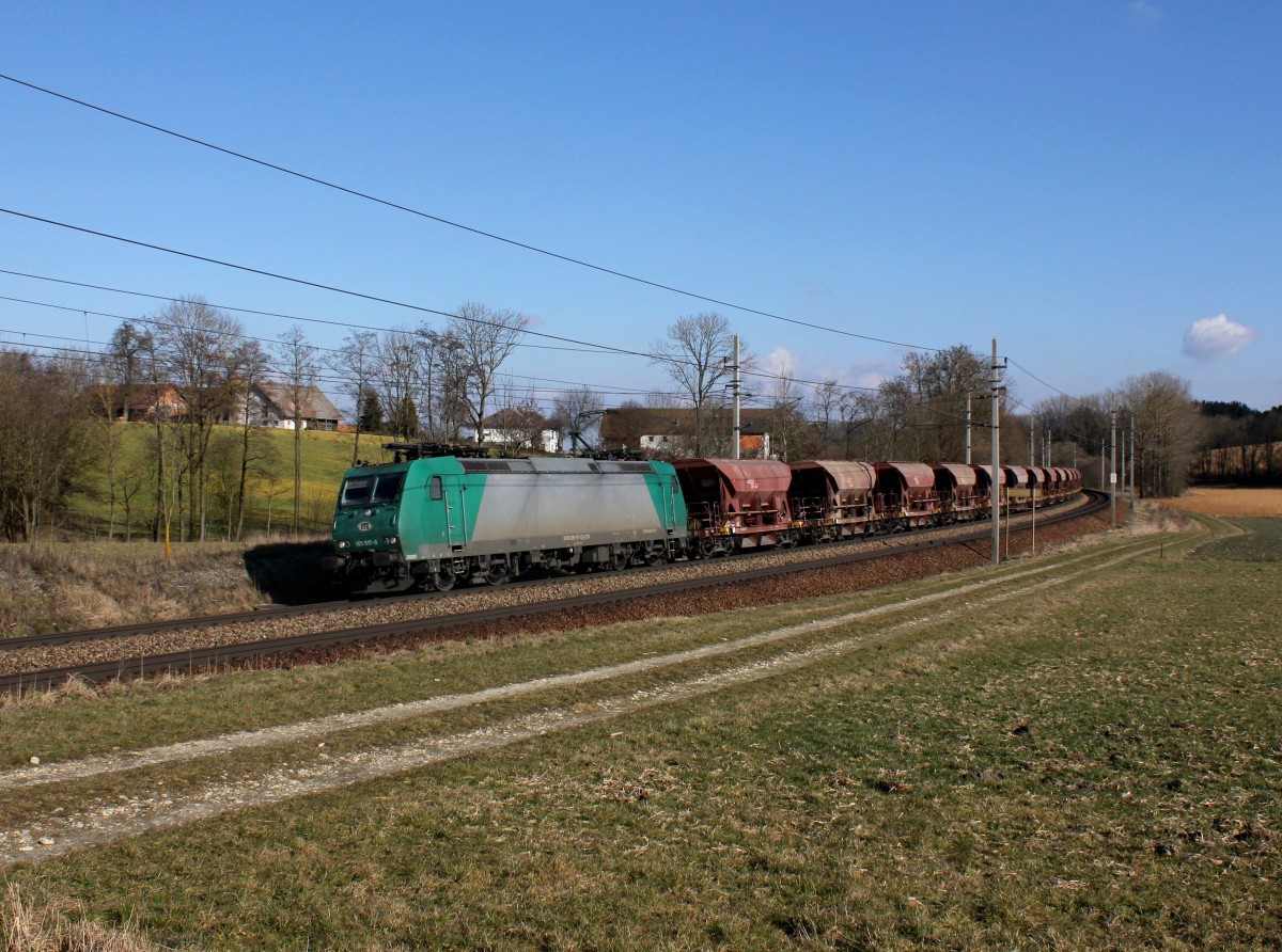 Die 185 517 mit einem Getreidezug am 23.02.2014 unterwegs bei Kimpling.