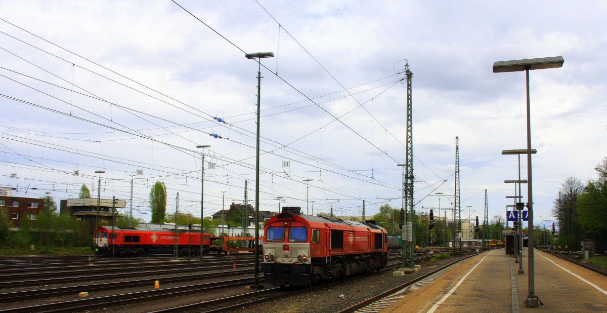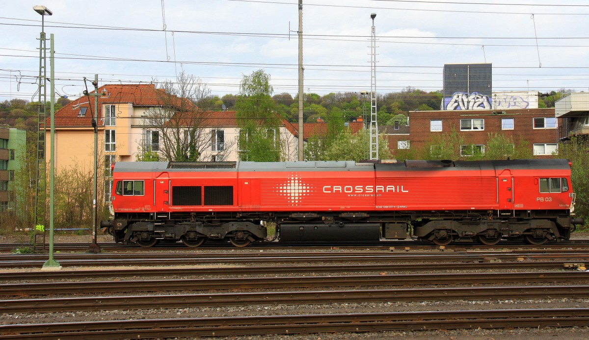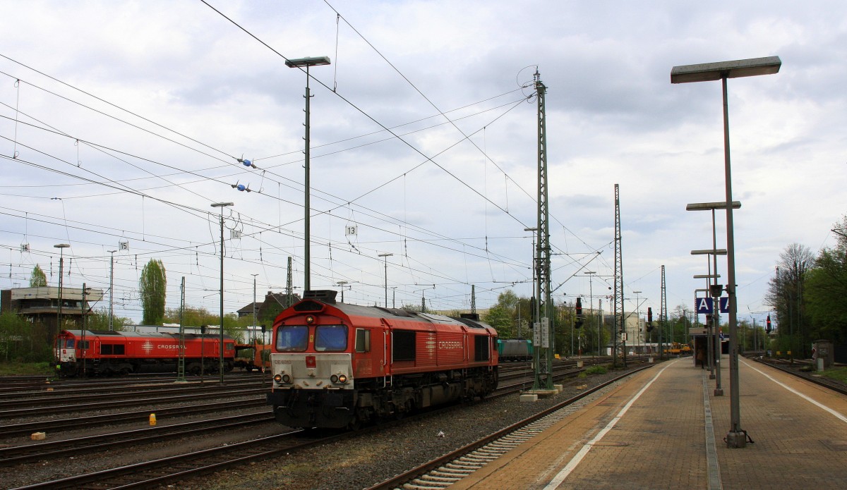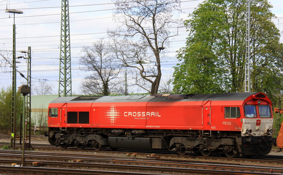 Die Class 66 PB03 "Mireille" von Crossrail steht mit Motor an in Aachen-West. Aufgenommen vom Bahnsteig in Aachen-West bei Sonne und Regenwolken am Nachmittag vom 6.4.2014.