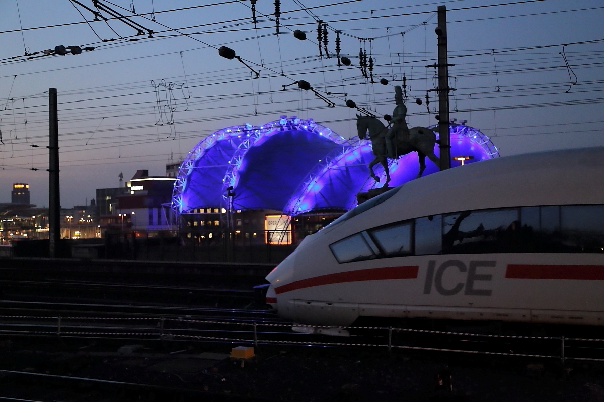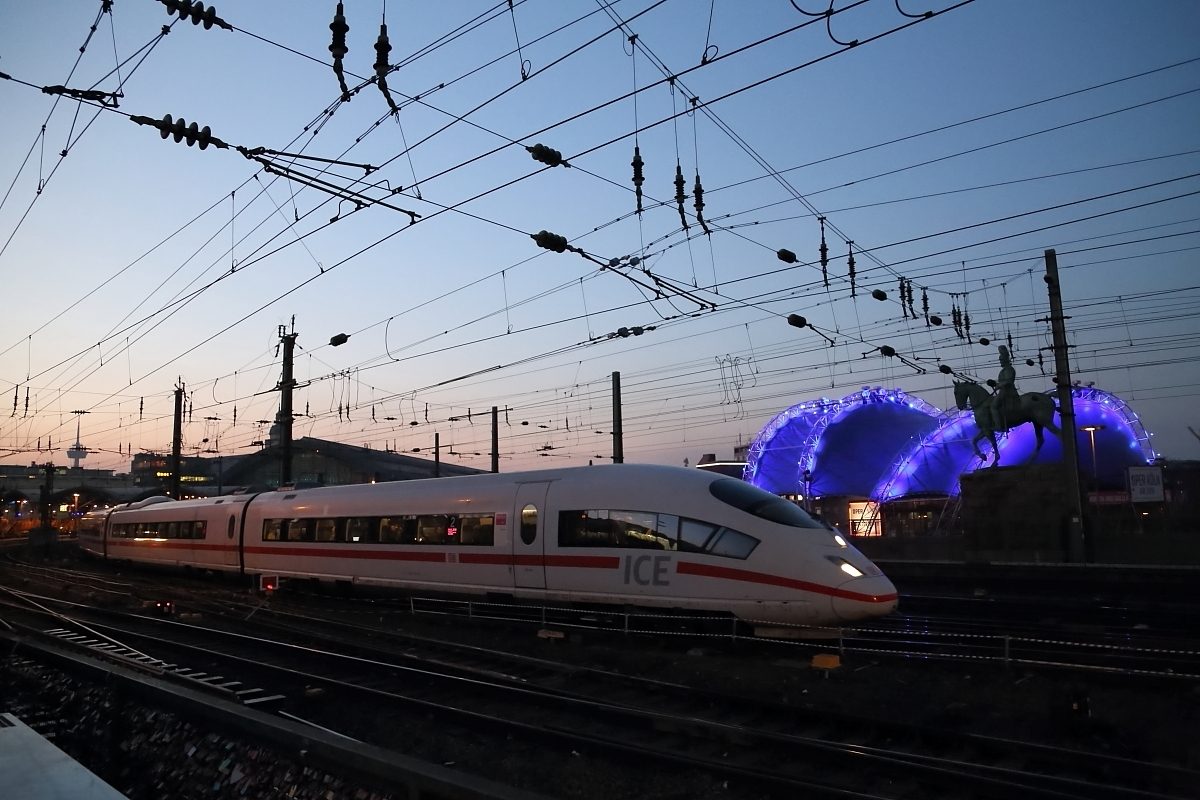 Ein ICE 3 mit Reiter als "Galeonsfigur" am Abend des 13.03.2014, kurz nach Verlassen des Kölner Hauptbahnhofes.