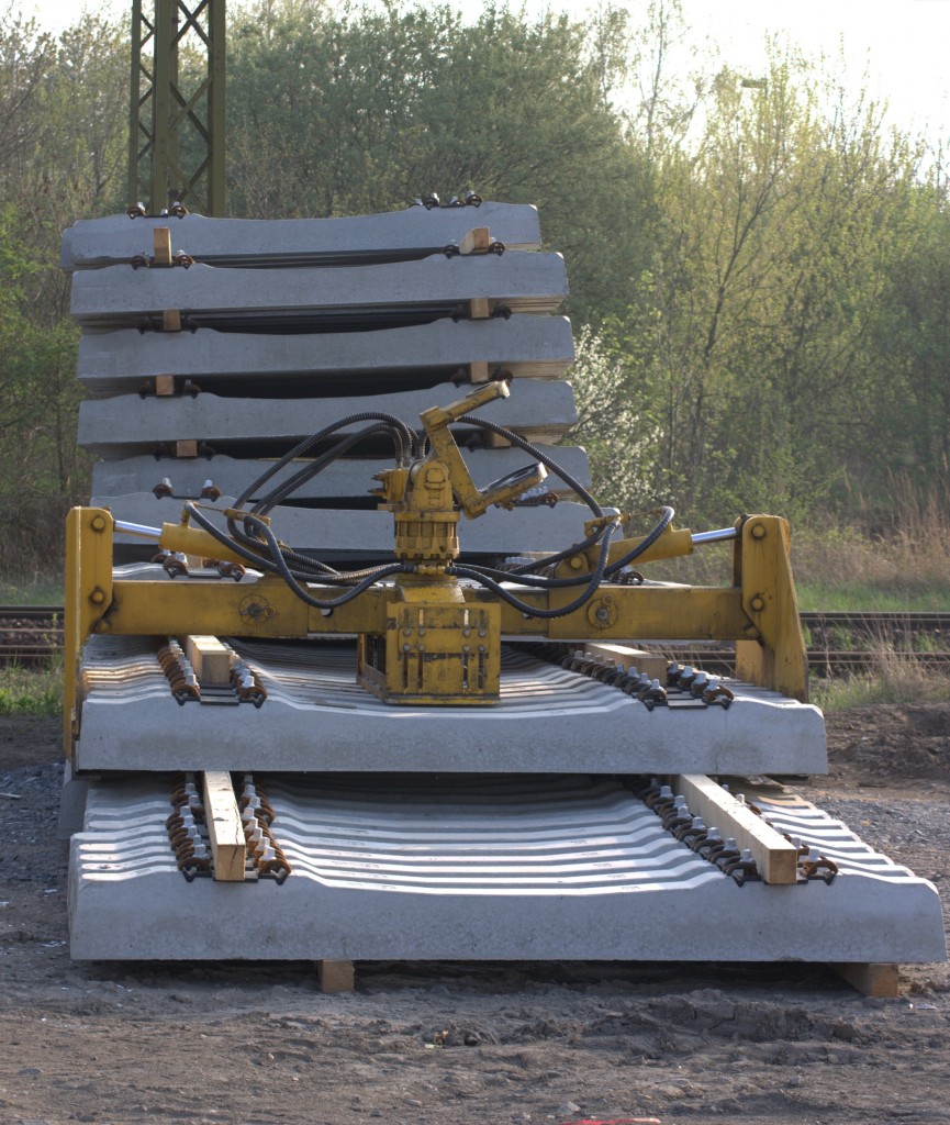Ein Schwellengreifer auf dem Platz am "Gleisdreieck" Coswig , der teilweise frisch planierte Platz wird als Gleismontageplatz genutzt. 06.04.2014 17:05 Uhr.