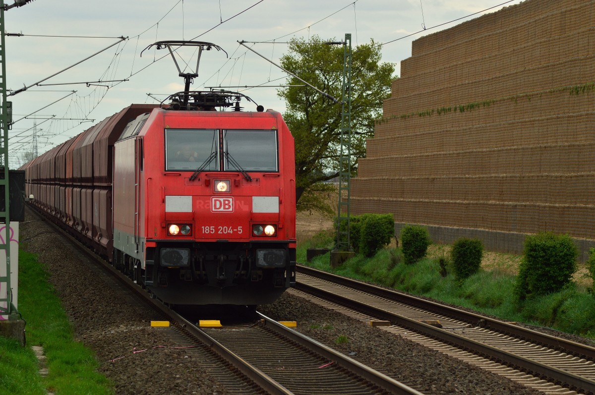 Gen Neuss kommt die 185 204-5 mit einem Schüttgutwagenzug bei Allerheiligen heran gedonnert......6.4.2014
