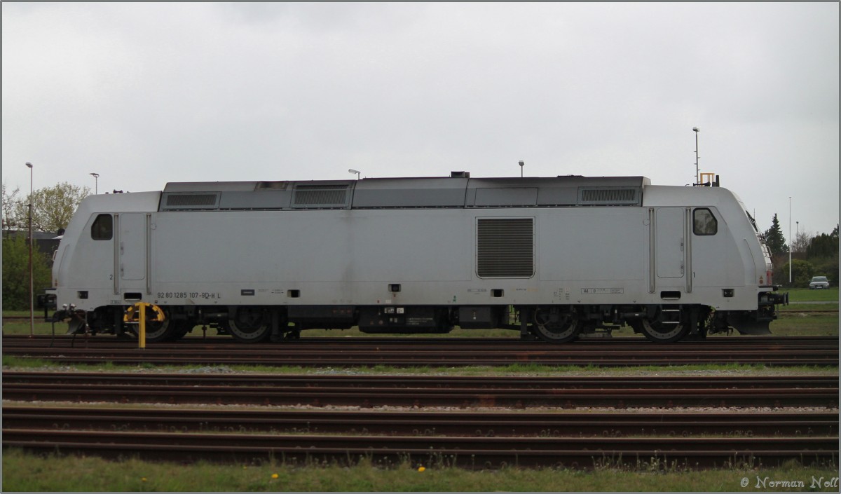 Grau in grau steht die 285 107-9 abgestellt in Wilhelmshaven / Tanklager. 09/04/2014