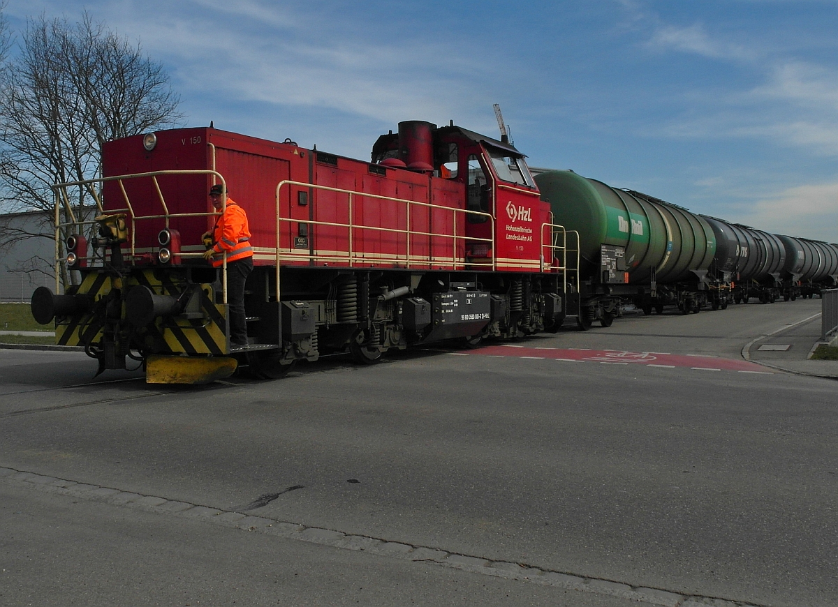 V 150 (98 80 0580 001-2) der HzL (Hohenzollerische Landesbahn AG) überquert mit leeren Kesselwagen eine Straße im Industriegebiet Ulm-Donautal, nachdem sie die Wagen von der Entladestation eines Heizölhändlers abgeholt hat (27.03.2014).