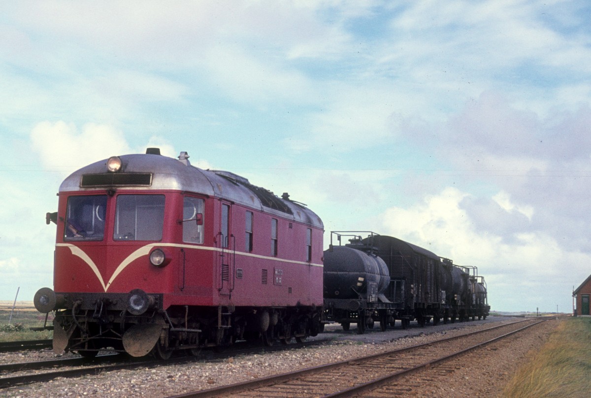 VLTJ (Vemb-Lemvig-Thyborøn-Jernbane, Lemvigbanen) Diesellok M12 (Frichs 1952) mit Güterwagen Rønland am 27. August 1974.