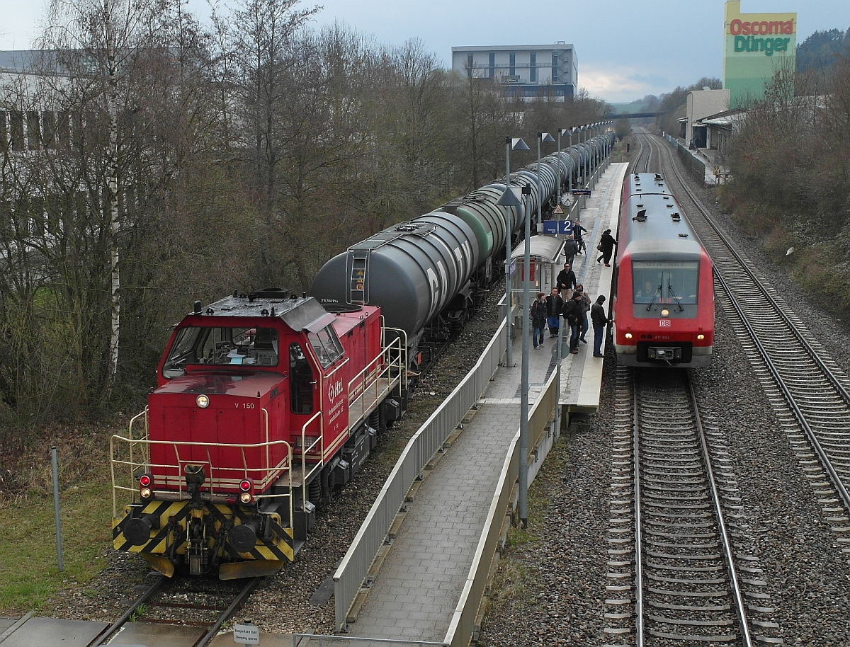 Während an der Haltestelle Ulm-Donautal Fahrgäste in den 611 032 einsteigen, der als RB 22620 von Aulendorf nach Ulm Hbf unterwegs ist, stellt hinter dem Bahnsteig V 150 der Hohenzollerischen Landesbahn leere Kesselwagen zu einem Zug zusammen (24.03.2014).