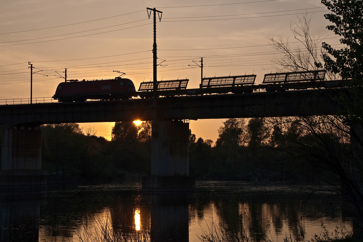 Während des Sonnenuntergang am Abend des 07.04.2014, konnte die BR 1116 mit einem Güterzug bei der Fahrt über die neue Donau in Wien fotografisch festgehalten werden.