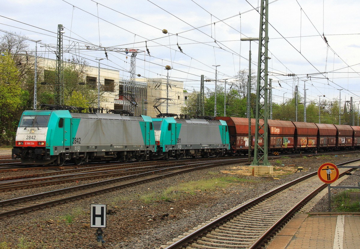 Zwei Cobra 2842 und 2811 kommen mit einem langen Kalkzug aus Yves-Gomezée(B) nach Millingen und fahren in Aachen-West ein. Aufgenommen vom Bahnsteig in Aachen-West bei Sonne und Regenwolken am Nachmittag vom 6.4.2014.