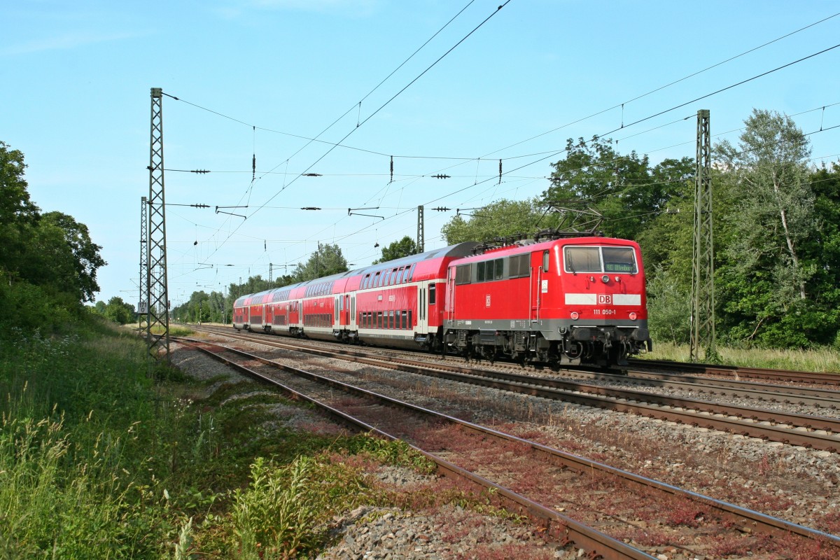 111 050-1 mit einem RE von Schliengen nach Offenburg am Nachmittag des 06.06.14 beim Verlassen des Bahnhofs Orschweier.