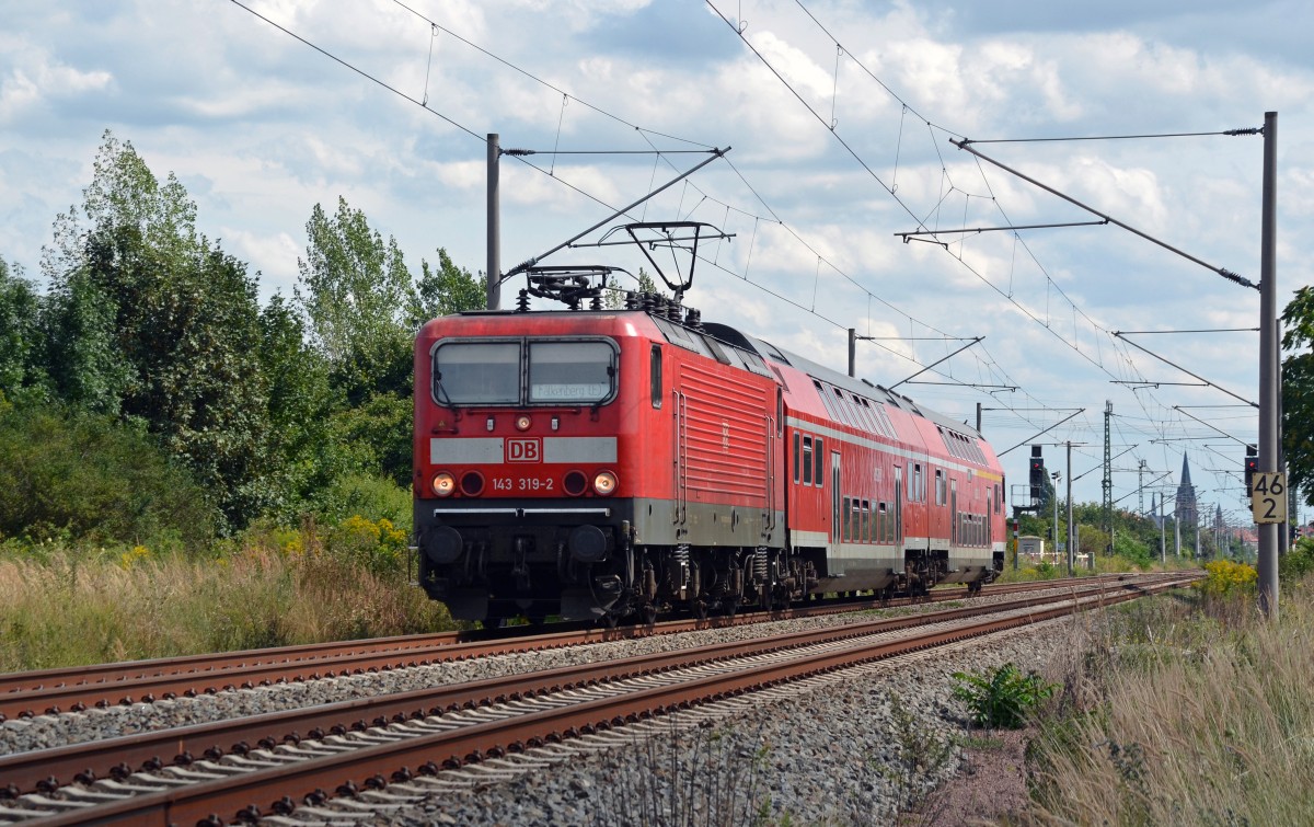 143 917 bespannte am 10.08.14 eine auf zwei Wagen geschrumpfte RB von Leipzig über Dessau nach Wittenberg.