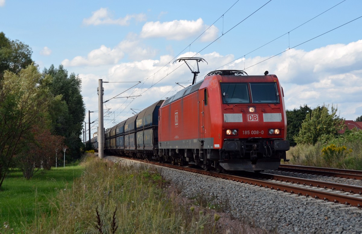 185 008 zog am 10.08.14 einen Ganzzug polnischer Kohlewagen durch Greppin Richtung Bitterfeld.