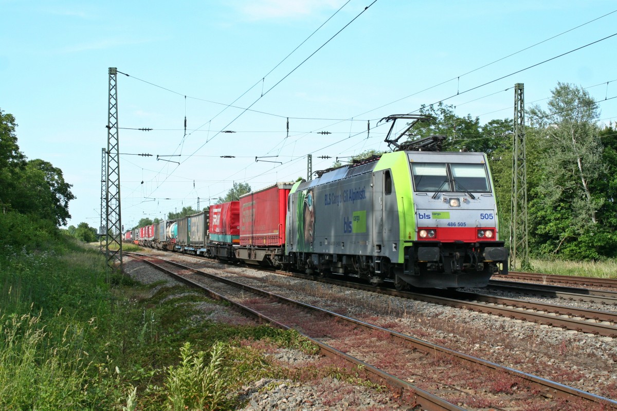 486 505 mit einem KLV-Zug von Venlo nach Melzo am Nachmittag des 06.06.14 in Orschweier.