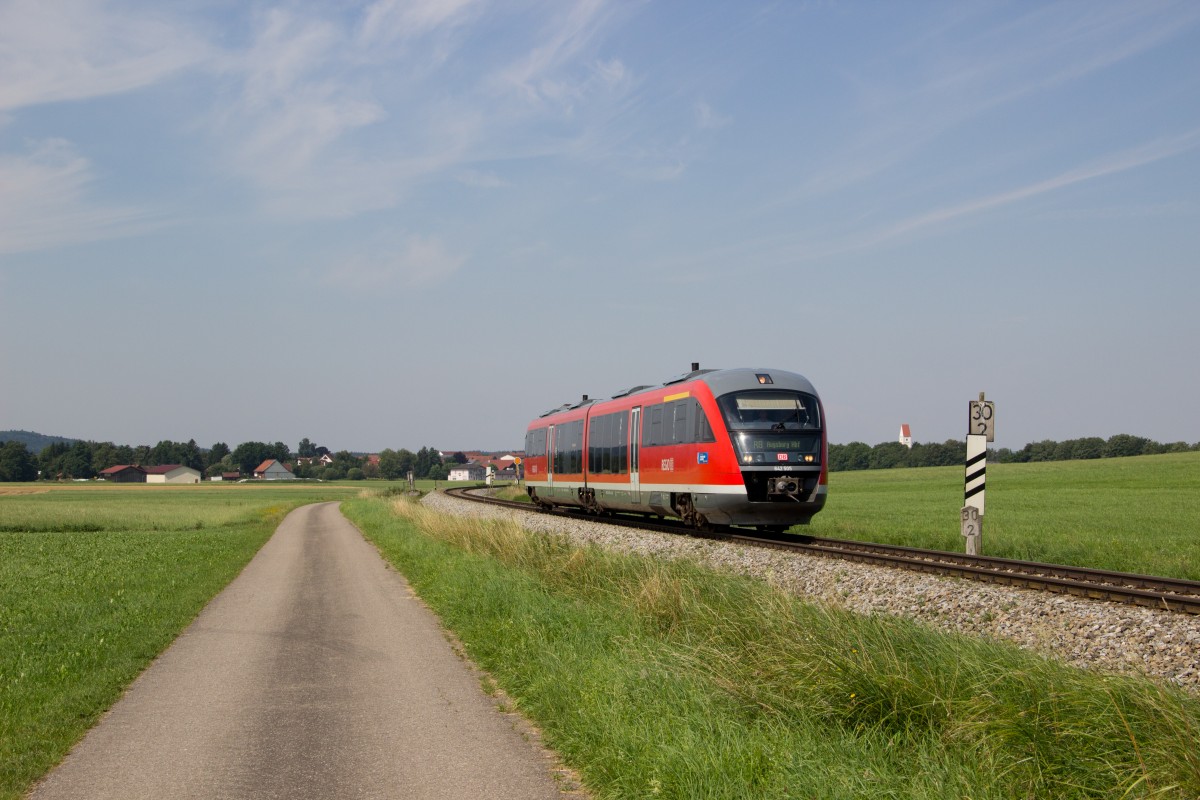 So fuhr ich in die Nähe von Aufhausen bei Erding. Es war eine mehr oder weniger harte Geduldsprobe, abzuwarten, bis diverse, dunkle Wolkenfronten vorbeizogen, um der Sonne Platz zu machen. Bei einem einzigen Versuch stimmten die Bedingungen. Im Hintergrund ist der Ort Niederwörth zu sehen, während ein 423 Richtung Erding eilte.
