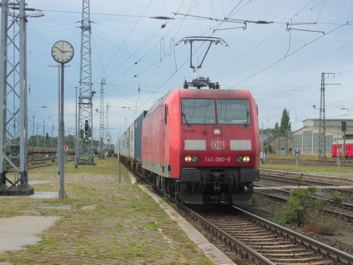 Am 16.08.2014 kam 145 080 mit einem Containerzug aus Richtung Hannover nach Stendal und fuhr weiter in Richtung Magdeburg.Dieses war ein Umleiter.