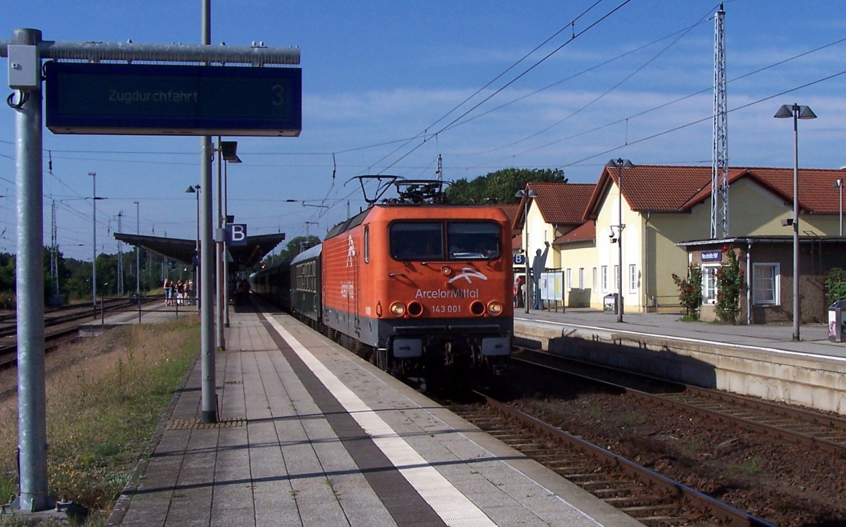 Am 9.8.14 in Neustrelitz Hbf.: 143 001 durchfährt mit einem Sonderzug des Lausitzer Dampflokclubs in Cottbus den Bahnhof. Ziel ist die Hanse-Sail in Rostock, die an diesem Wochenende stattfand. Der Wagenzug bestand überwiegend aus DR-Rekowagen Bghw, einem BDghwse, 2 Begleiterwagen (ex Bghw), einem WRGge sowie einem langen Halberstädter Am. Die Lok hat eine wechselvolle Geschichte: Zuerst bei LEW-Hennigsdorf 1982 als Musterlok für die Familie 212 /243 (heute 112,114 und 143) gebaut, wurde sie zuerst als 212 mit Höchstgeschwindigkeit 140 km/h erprobt, dann umgebuat zur 243 mit 120km/h. In dieser zeit hatte sie einene auffälligen weißen Anstrich mit roter "Bauchbinde", später die normale Lackierung der DR-Loks. Sie wurde zwar auch von der DR eingesetzt, war aber nicht verkauft. Ende der 80-er Jahre kam sie zurück nach Hennigsdorf und sollte erneut als Versuchslok umgebaut werden, dabei erhielt sie auch einen neuen Anstrich in Weinrot/ Weiß mit LEW-Logo an den Seiten.