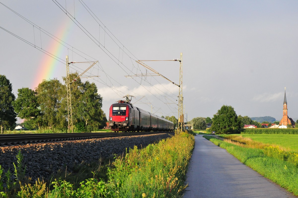 Die 1116 214 der ÖBB vor einem Railjet mit Regenbogen im letzten Abendlicht am 15.08.14 bei Übersee am Chiemsee.