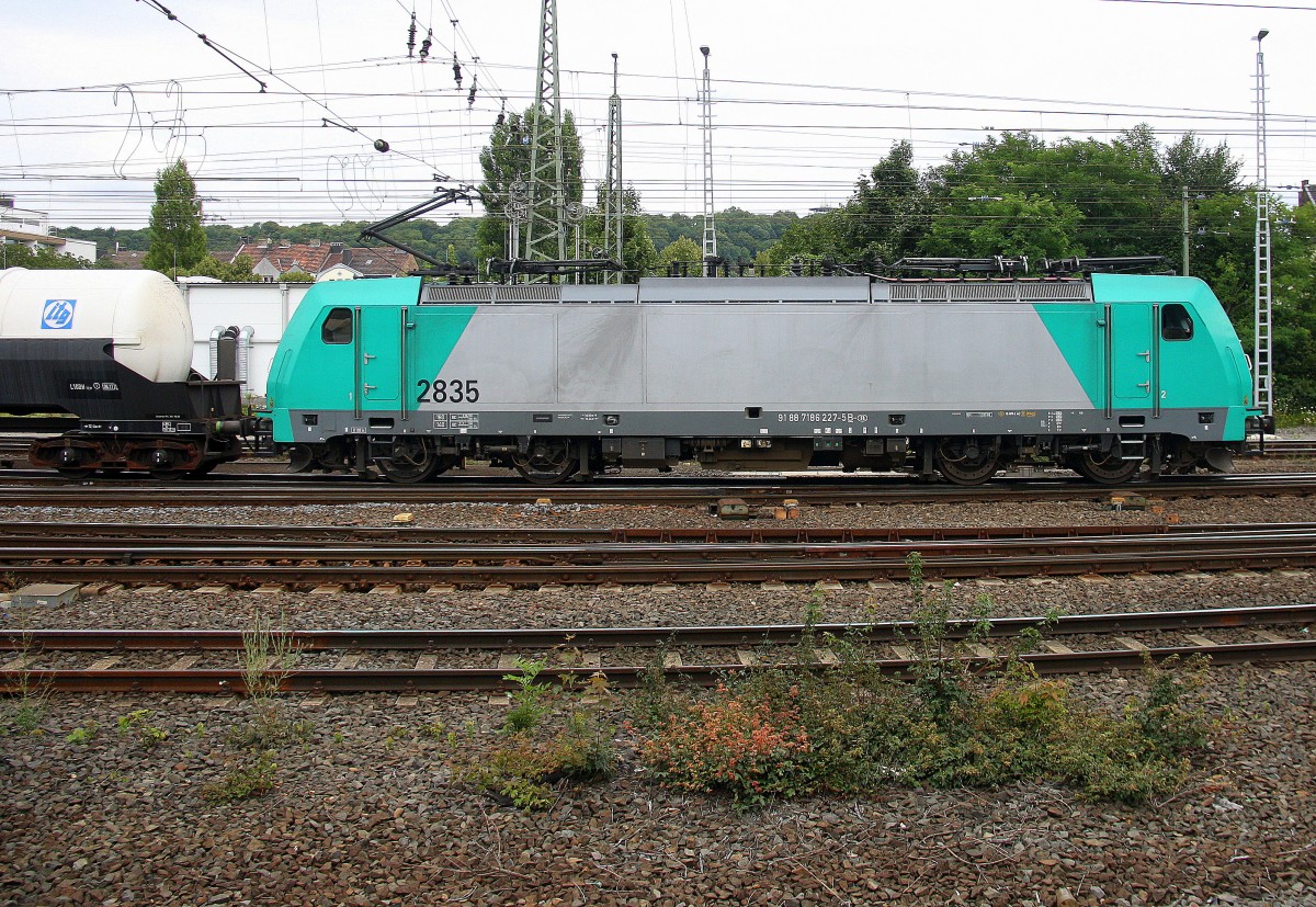 Die Cobra 2835 fährt mit einem langen gemischten Güterzug aus Köln-Gremberg nach Antwerpen-Noord(B) bei der Ausfahrt aus Aachen-West in Richtung Montzen/Belgien. Aufgenommen vom Bahnsteig in Aachen-West bei schönem Sonnenschein am 6.8.2014.