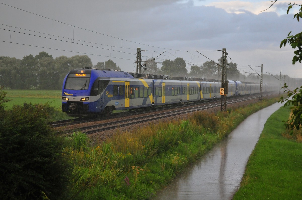 Kurz nach einem heftigen Regenschauer durchfährt ET 7.02 der Eurobahn am 16.08.2014 Kleinenbroich