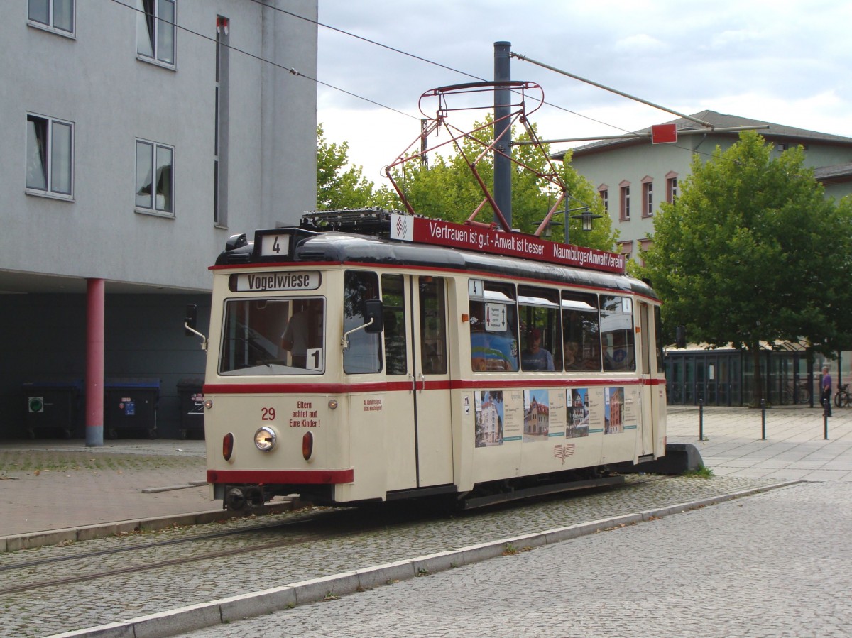 Naumburger Straßenbahn: 28.08.2011 - Triebwagen 29, Typ "Lowa", Bj. 1955, renoviert 2009/2010 mit 22 Sitzplätzen, auf Linie 4 Richtung Vogelwiese an der Endstelle Bahnhof Naumburg.