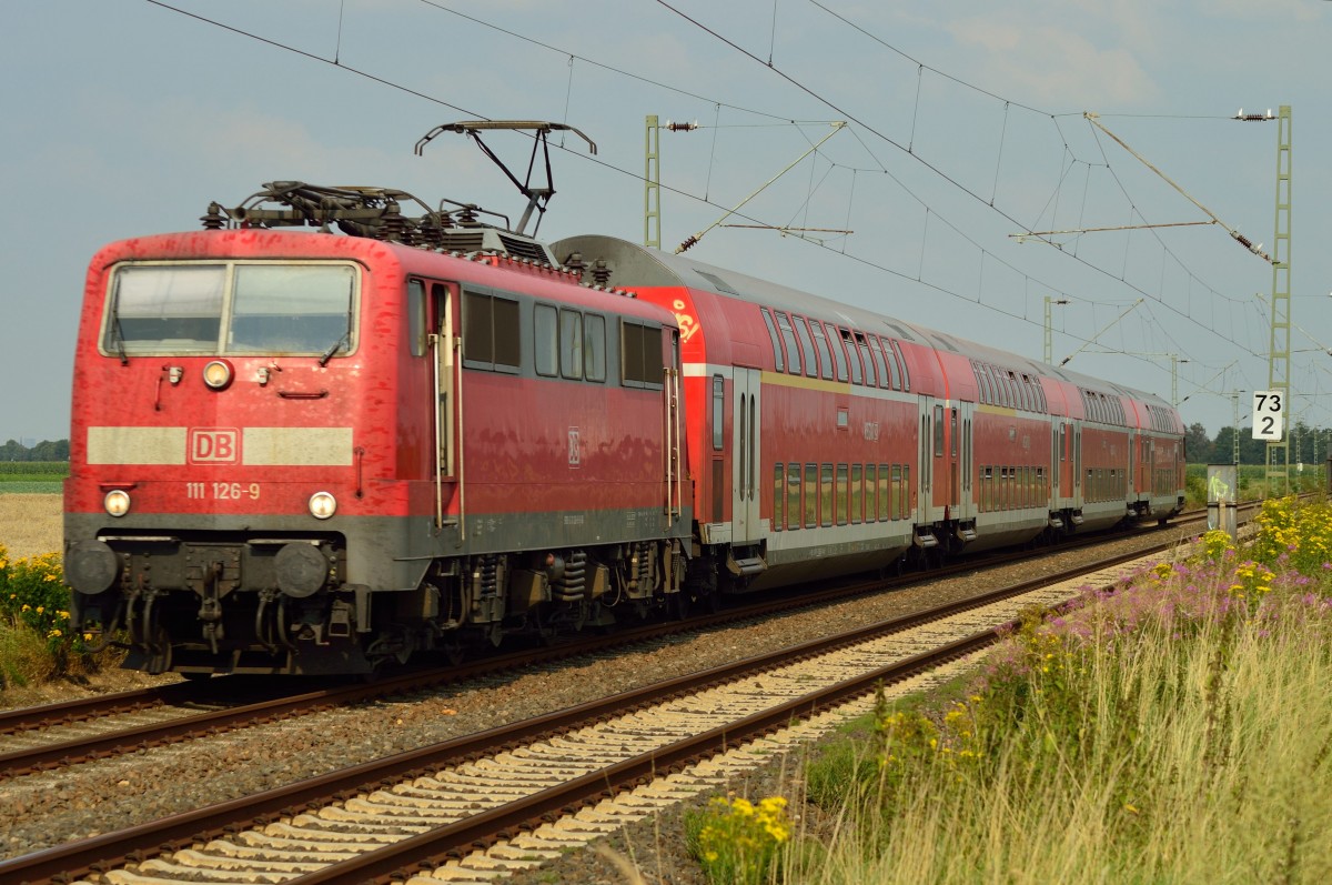 Am 1.8.2014 schiebt die 111 118-6 einen RE4 Zug nach Dortmund. Hier ist der Zug zwischen Kleinenbroich und Büttgen auf der Kbs 485 zu sehen.