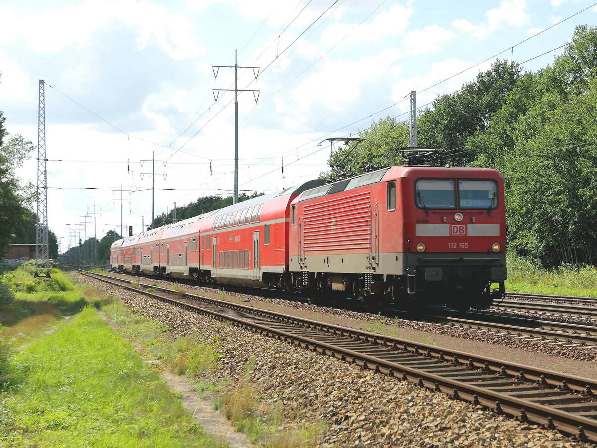 Am 01.08.2014 zieht die 112 152-4 den IRE 18539 von Rostock Hbf nach Berlin Hbf, hier bei der Durchfahrt in Nassenheide.