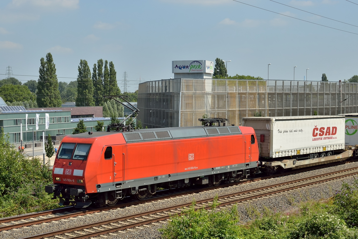 185 051-0 zieht am 31.07.2014 einen Autotransportzug. Die Ladung besteht gänzlich aus Ford KA. Im Hintergrund sieht man die Perle kostenoptimierter moderner Profanbauarchitektur: Das Parkhaus des Aquapark Oberhausen (Spaßbad).