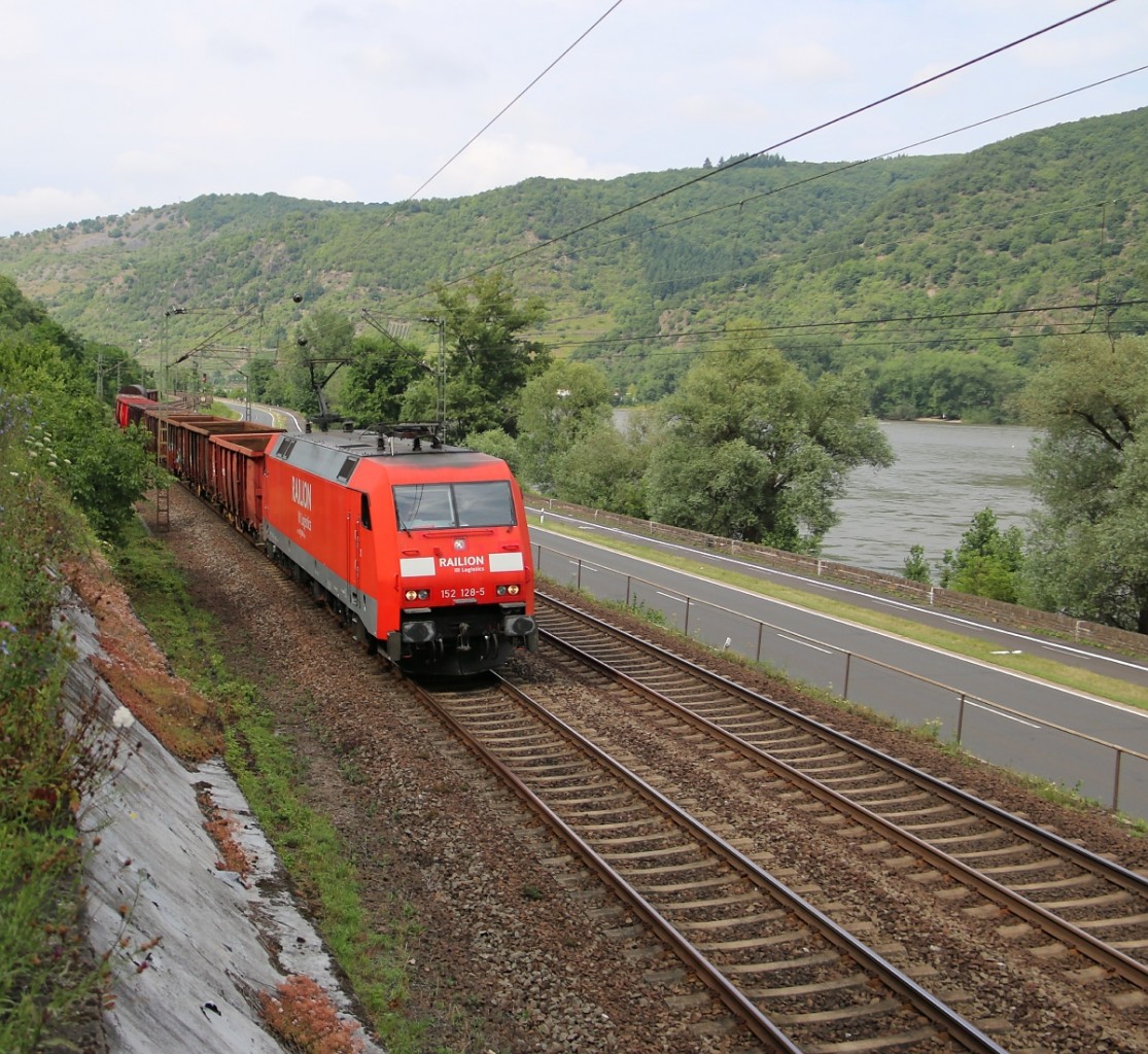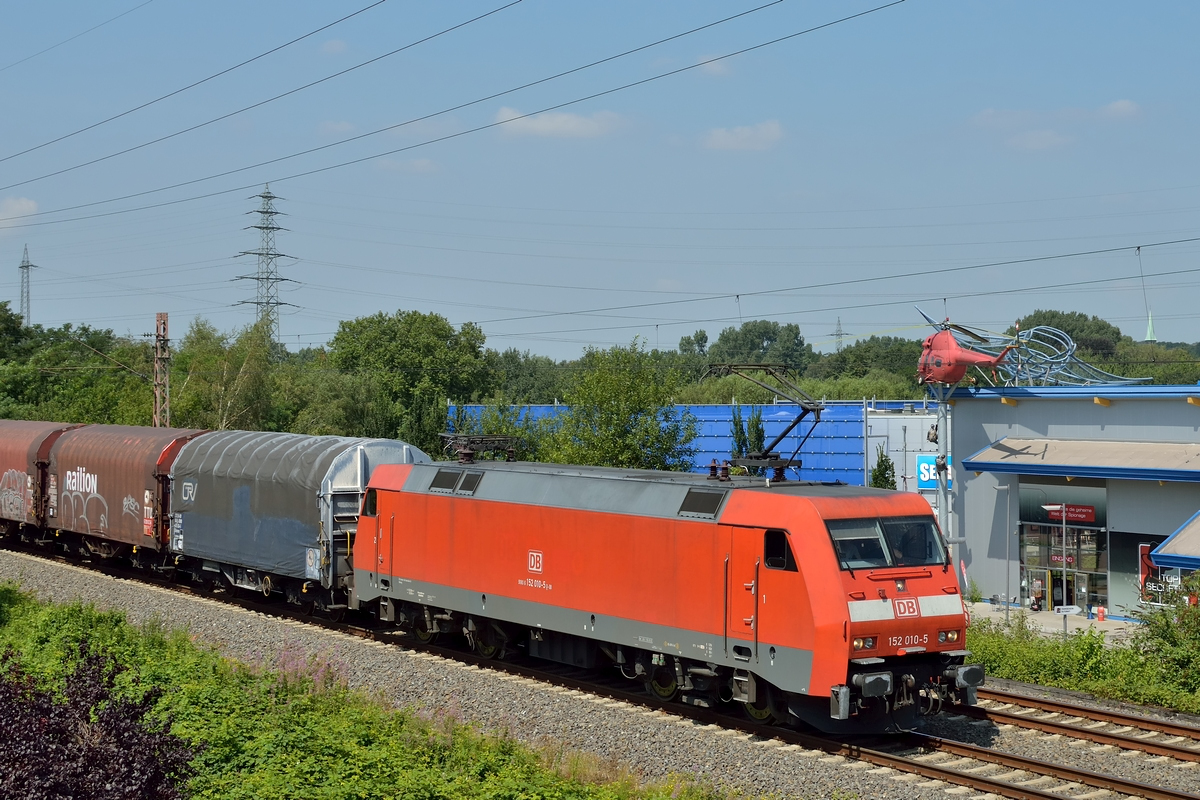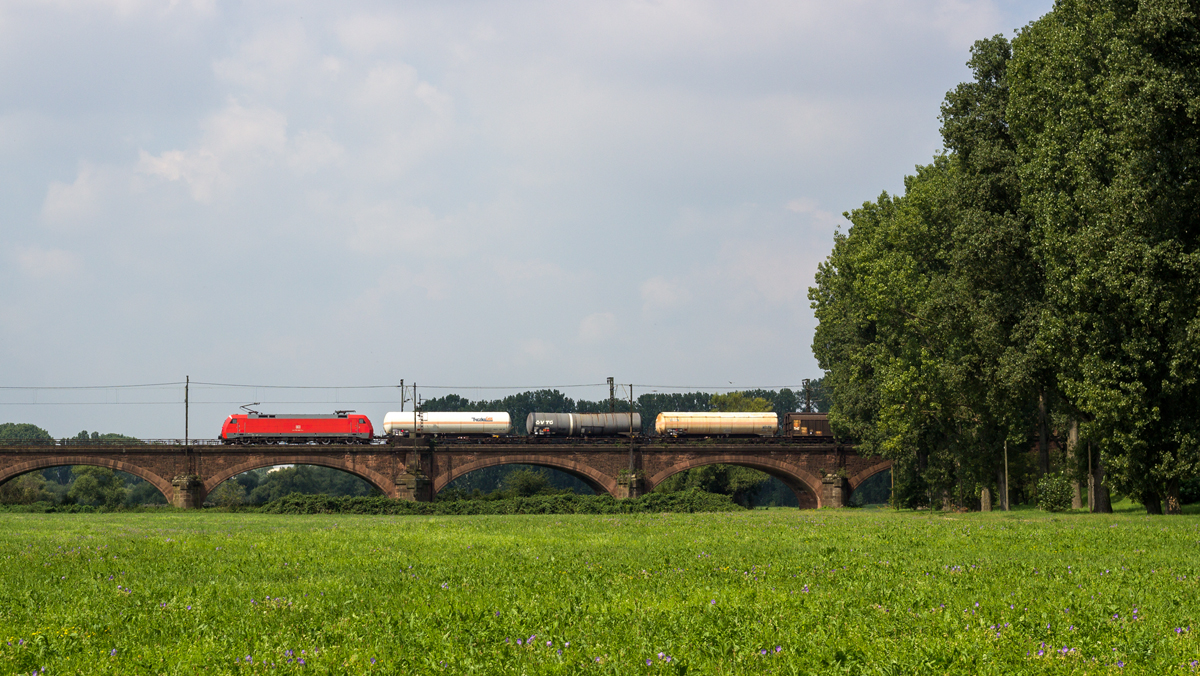 Das schöne Mittelrheintal hat dieser Güterzug, bespannt mit einer Lok der Baureihe 152, hinter sich gelassen, er steuert nun den Rangierbahnhof Mainz-Bischofsheim an. Zuvor muss allerdings noch der Main bei Hochheim auf einer Brücke überquert werden (31.07.2014)