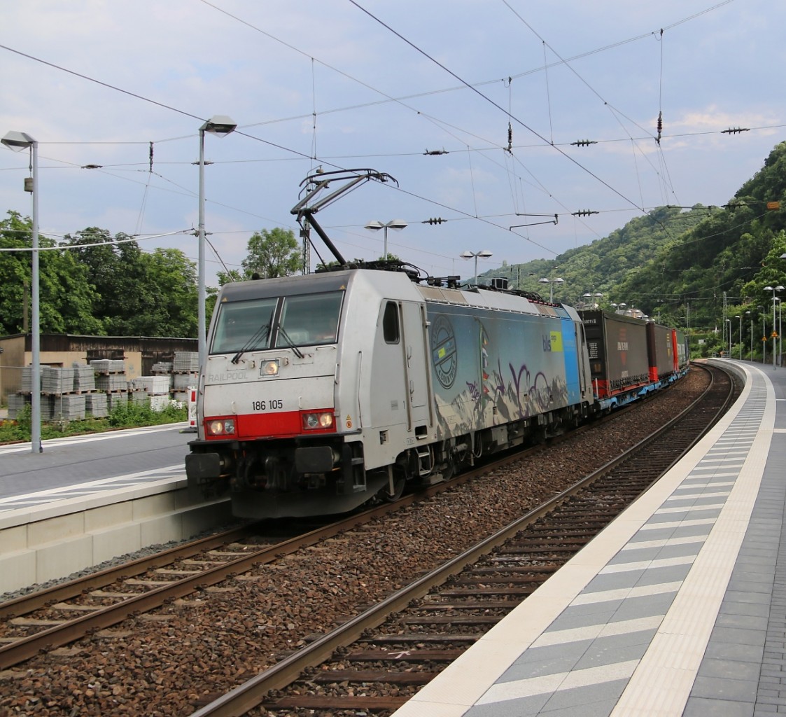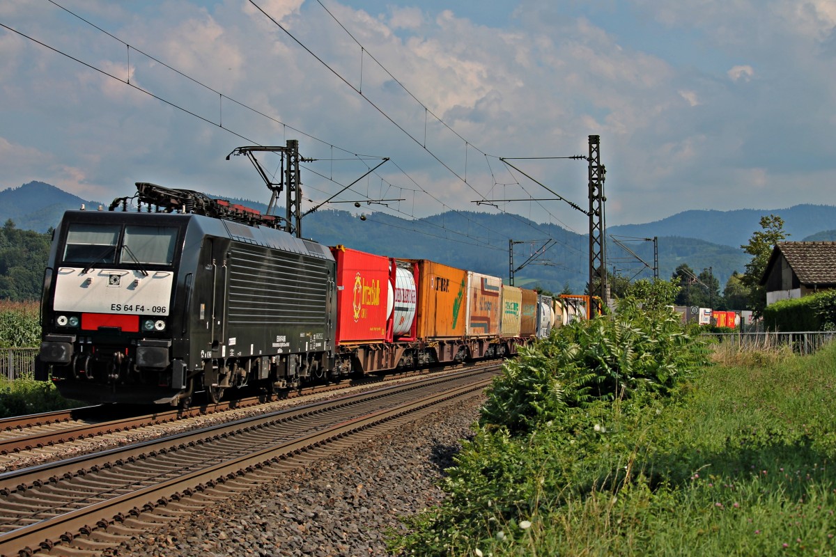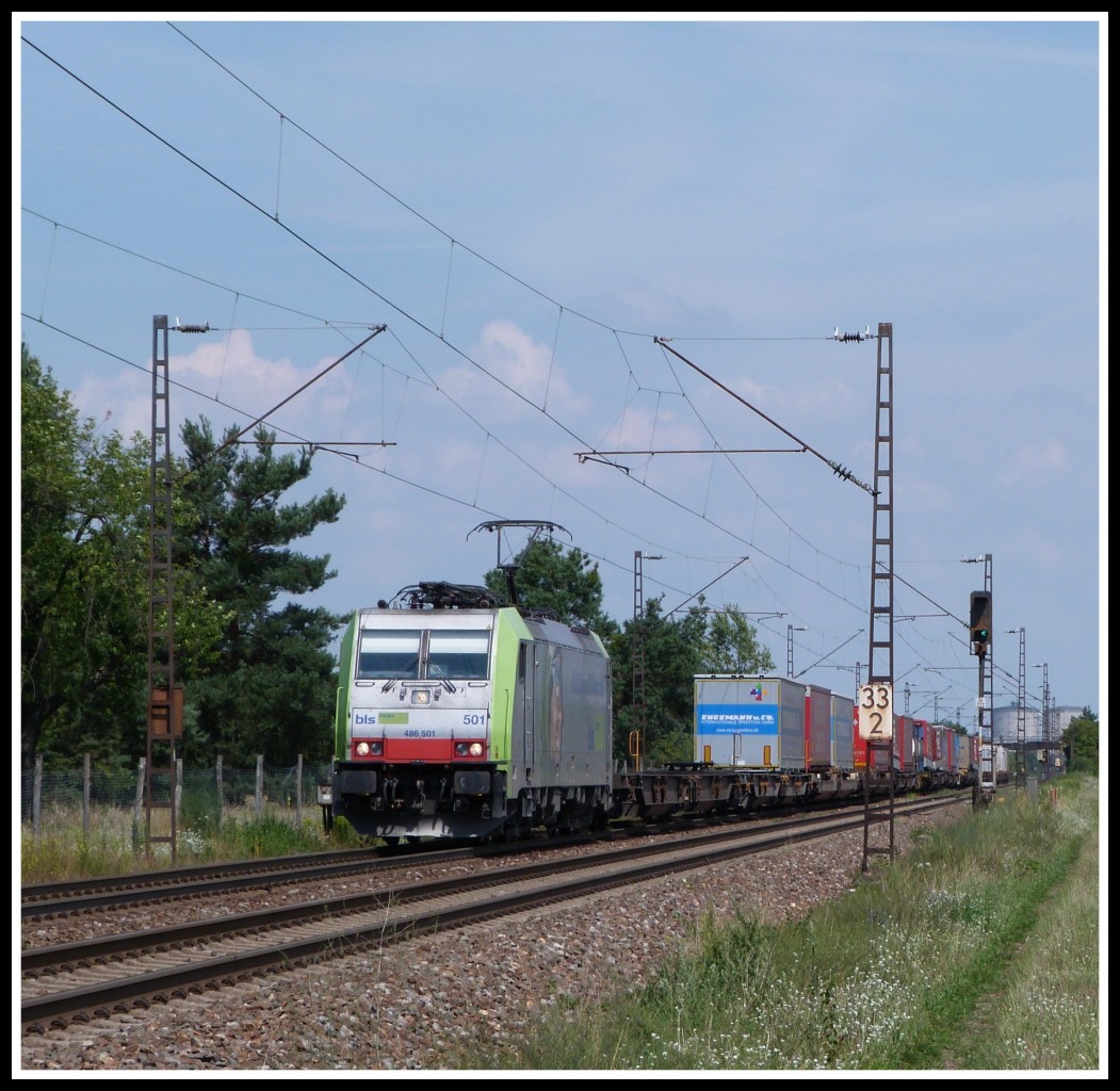 Mit Fernlicht und Hupe kam am 01.08.2014 auch Railpool/BLS Cargo 186 103 mit einem Containerzug in Kollmarsreute vorbei, als sie auf der Fahrt in den Norden war.