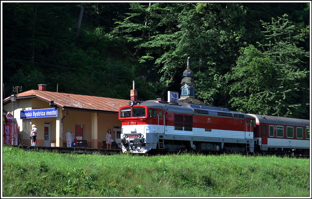 Auch 757 007-0 mit EC222 "Detvan" hält am Haltepunkt Banská Bystrica Mesto. Diese Haltestelle liegt wesentlich näher am Stadtzentrum, als der eigentliche Hauptbahnhof. (07.06.2014)